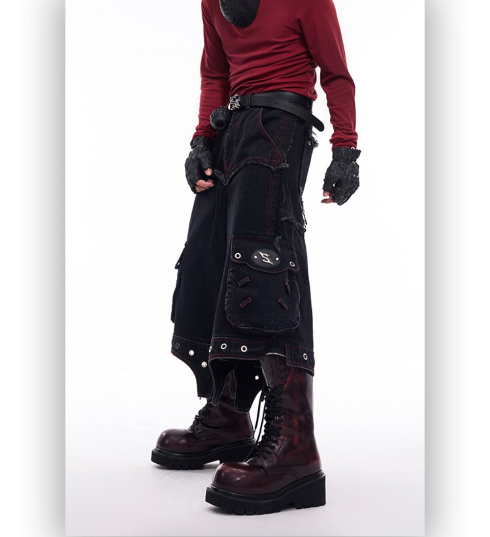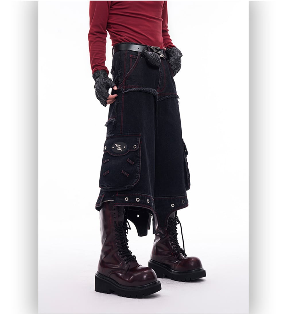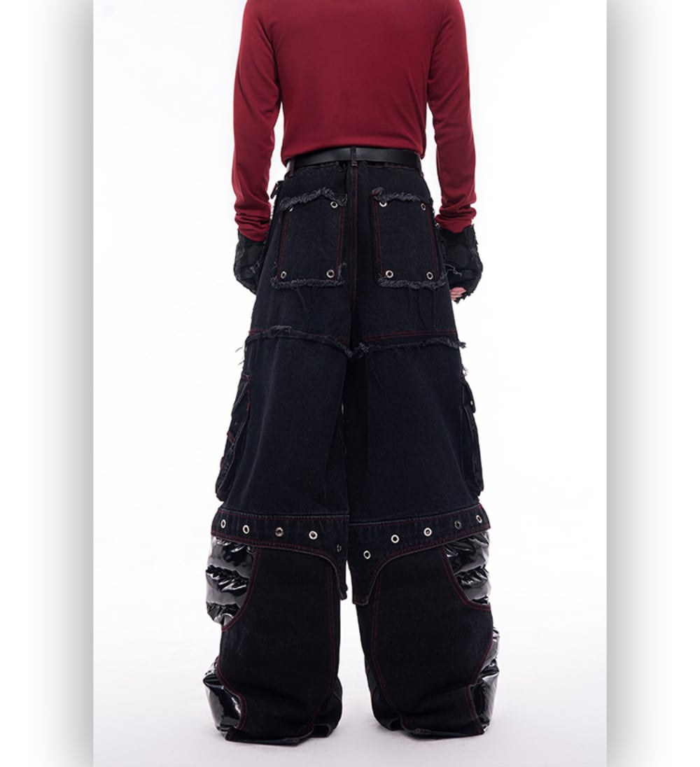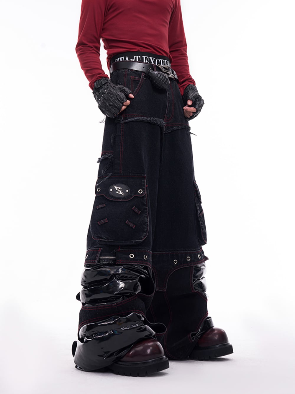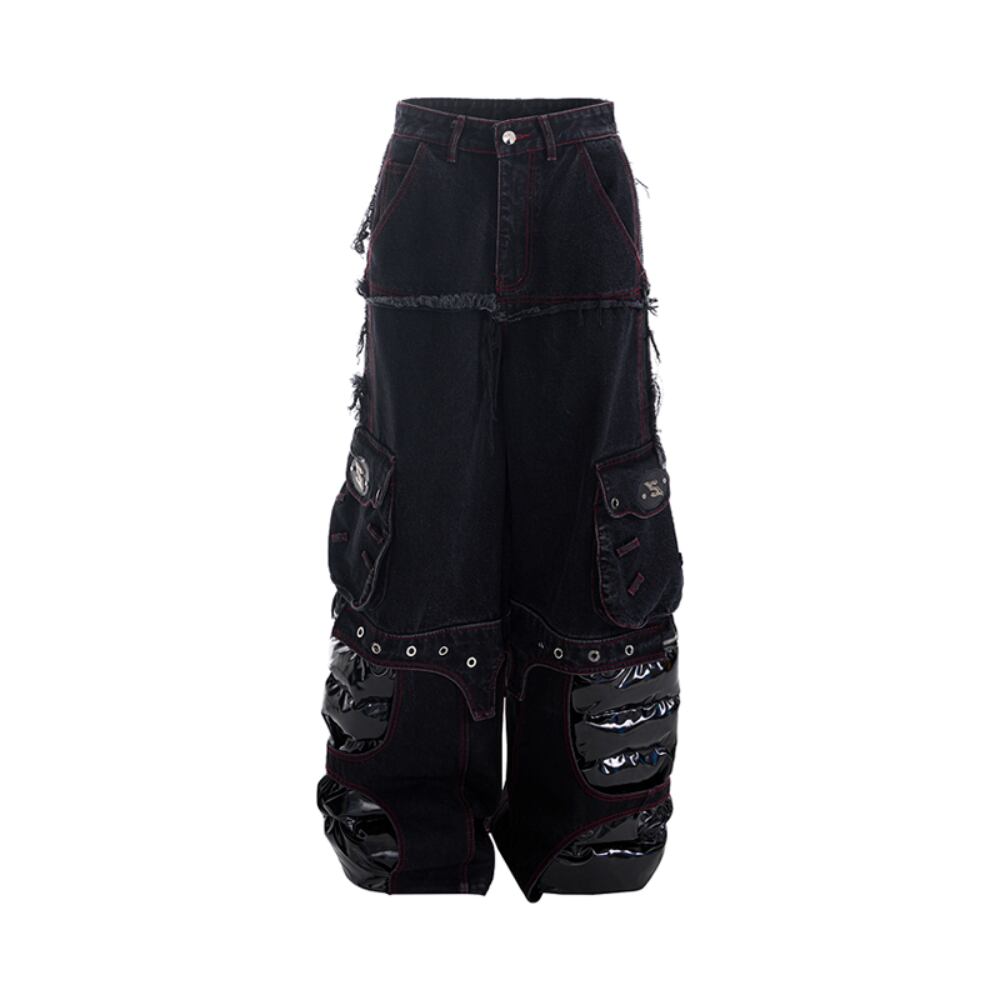 STARTEXCEEDEND 2WAY カーゴデニムパンツPUレザー切替フリンジ